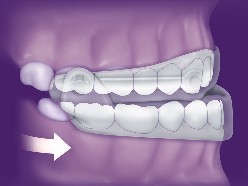 Das grazile Gerät wirkt gegen Atempausen und Schnarchen, indem es den Unterkiefer bzw. die Zunge nach vorn verlagert. So wird verhindert, dass die Zunge im Schlaf nach hinten sinkt und die erschlaffte Rachenmuskulatur kollabiert. Die Atemwege bleiben frei, das Schnarchgeräusch wird deutlich reduziert bzw. ganz beseitigt.